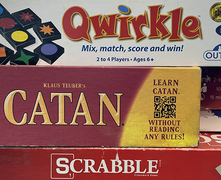 Two can play that game… or three, or four! Drop in to browse the Game Cart and play some tabletop games, including Catan, Scrabble, Codenames, Qwirkle, and more.
